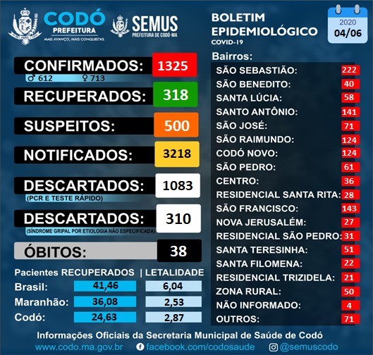 38 mortos, 1.325 casos confirmados de Novo CORONAVÍRUS em CODÓ