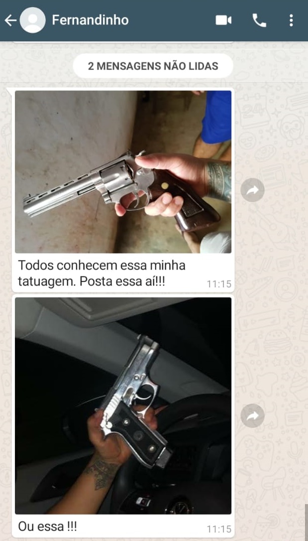 “Todos conhecem essa minha tatuagem, posta essa aí, ou essa outra, escolhe aí”, ironiza Fernandinho ao mostrar uma foto com o revólver em punho.