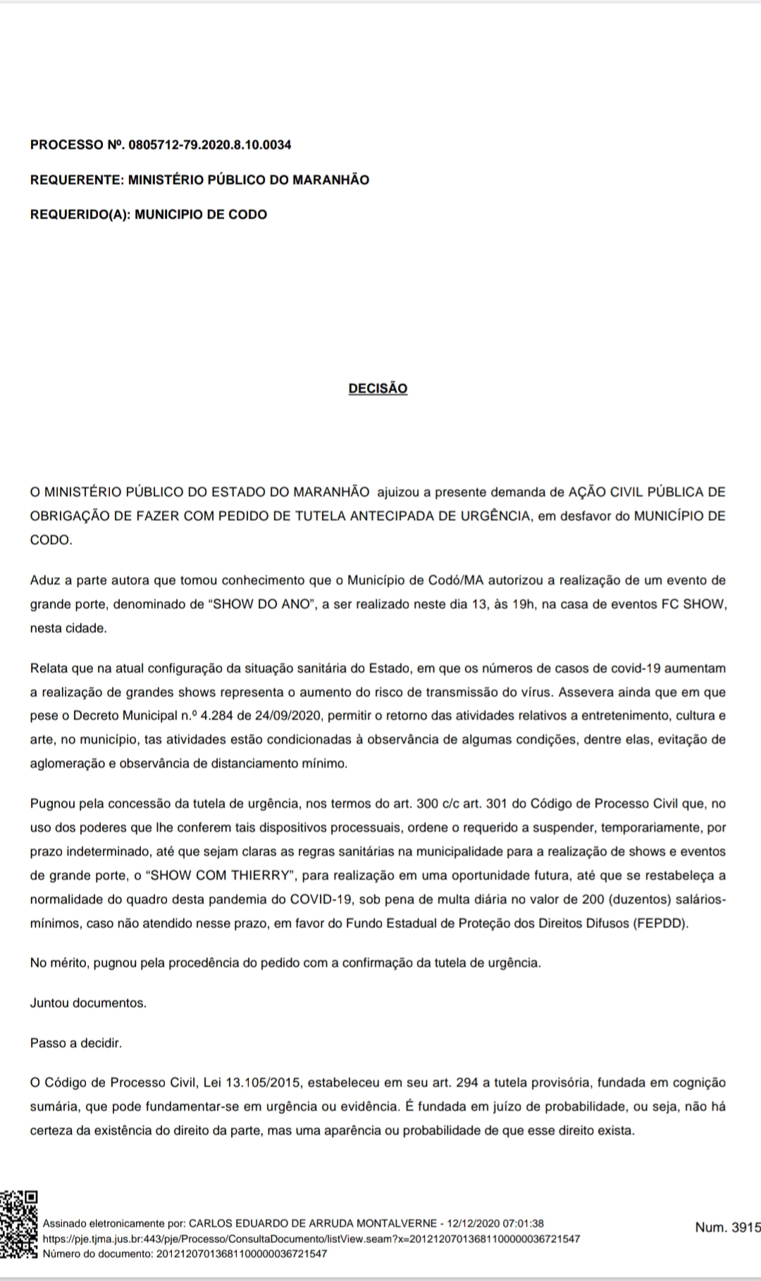 O Ministério Público entrou com uma AÇÃO CIVIL PÚBLICA na primeira Vara da Comarca de Codó pedindo o cancelamento do evento intitulado ‘O SHOW DO ANO’ cuja maior atração é o cantor THIERRY, do hit ‘Rita’.