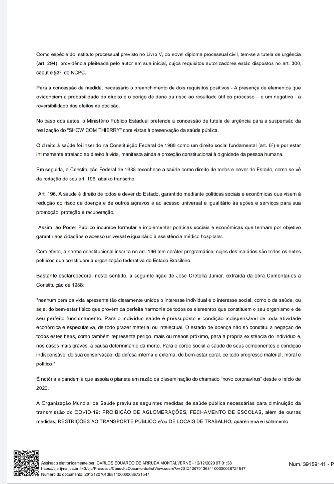 O Promotor de Justiça alegou que “a atual configuração da situação sanitária do Estado, em que os números de casos de Covid-19 aumentam, a realização de grandes shows representa o aumento do risco de transmissão do vírus“. Disse ainda que “em que pese o DECRETO MUNICIPAL Nº 4.284, de 24/09/2020, permitir o retorno das atividades relativas a entretenimento, cultura e arte, no município, tais atividades estão condicionadas à observância à algumas condições, dentre elas, evitação de aglomeração e observância de distanciamento mínimo”
