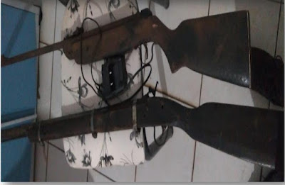 Após buscas no local foram localizadas três motocicletas abandonadas e escondidas nas proximidades duas espingardas, sendo uma artesanal (bate buchas) e outra calibre 22mm e um carregador de rádio de comunicação.