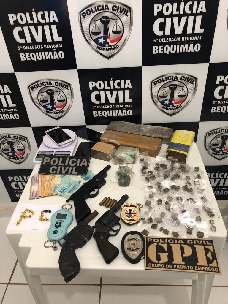 Durante o cumprimento dos mandados, foram encontrados 2,5( Dois quilos e Quinhentos grama) de maconha em barra, 69 (sessenta e nove) cabeças de maconha já embaladas para comercialização, 16 (Dezesseis) cabeças de Crack prontas para o comércio, um revólver calibre 38(Trinta e oito) com cinco munições intactas, uma garrucha de fabricação caseira, uma quantia de um mil cento e sessenta e seis reais em espécie e 3 (Três) celulares.