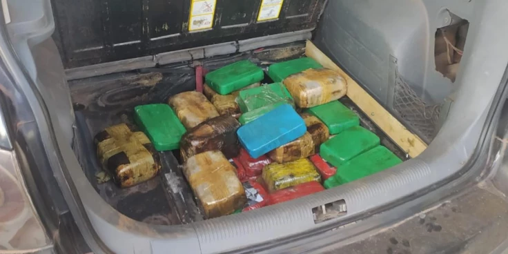Durante a busca veicular, os policiais identificaram a presença de um fundo falso no porta-malas de um dos carros, onde foram encontrados 98 tabletes de entorpecente do tipo crack que, ao serem pesados, totalizaram 98,9 kg da droga.