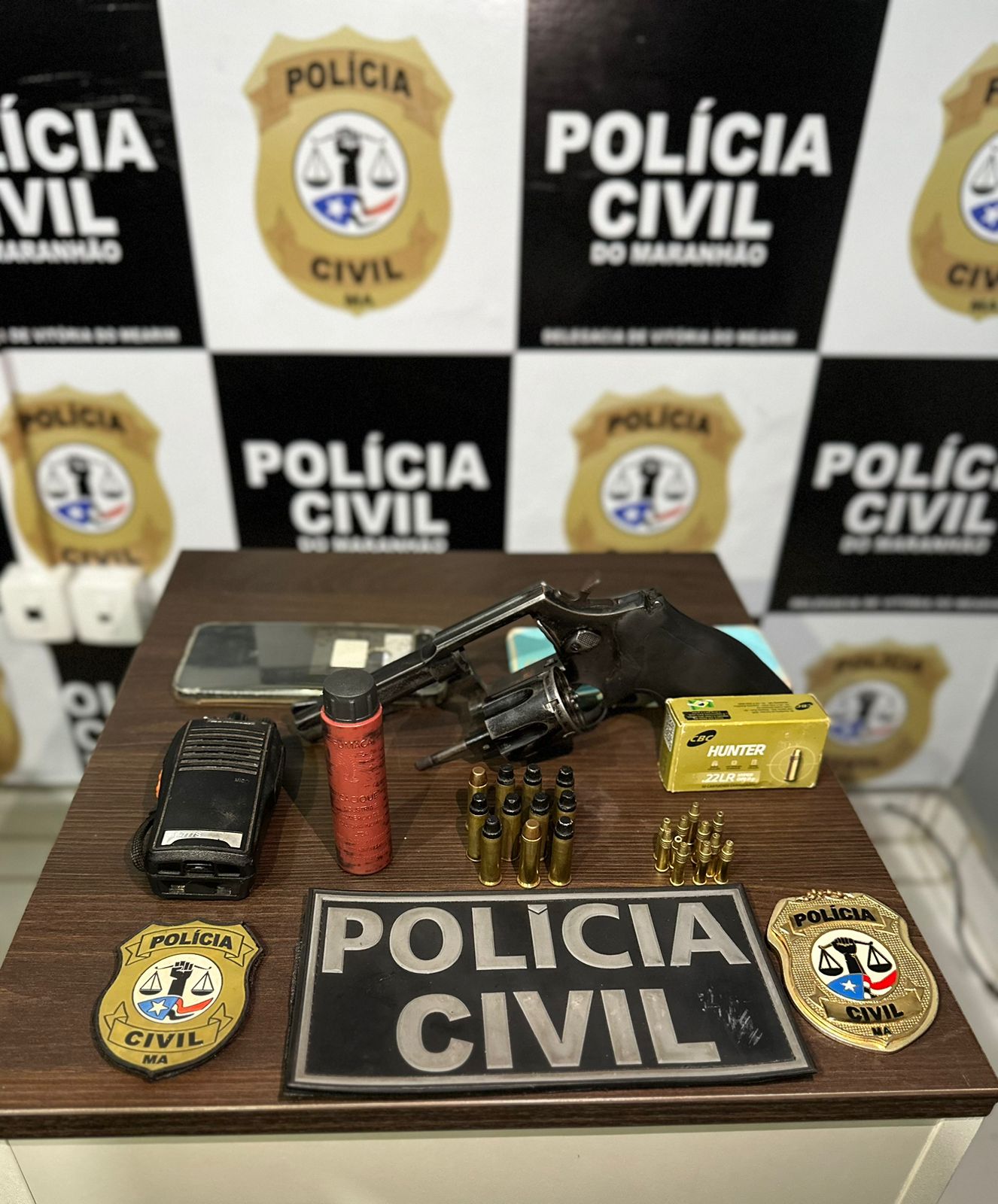 Durante o cumprimento do mandado de busca domiciliar, os policiais apreenderam um revólver calibre .38; 11 munições intactas de igual calibre, além de 11 munições calibre .22 e demais objetos.